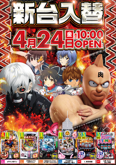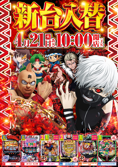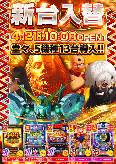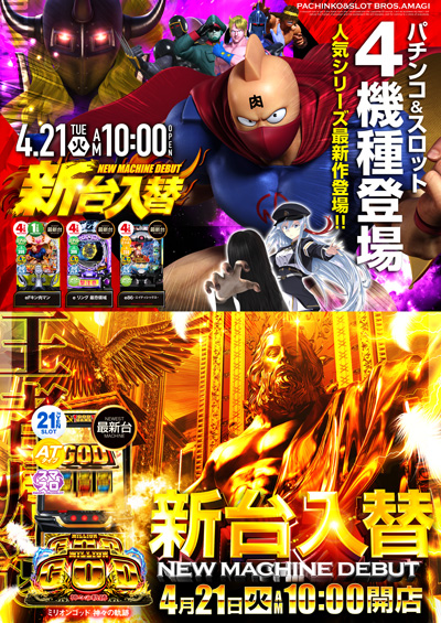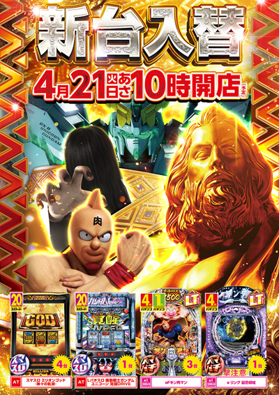 ![]() | ブロス甘木店 | 【新台入替】 4月21日あさ10時オープン!【導入機種】「パチンコ」・eFキン肉マン・e リング 最恐領域・e86‐エイティシック... |