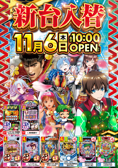 ![]() | ブロス八代鏡店 | 【新台入替】 11月5日あさ10時オープン!【導入機種】「パチンコ」・e花の慶次~黄金の一撃・e ノーゲーム・ノーライフ 319... |