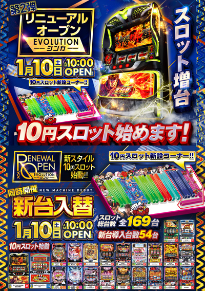 ![]() | ブロス宇城小川店 | 【リニューアル・新台入替】 1月10日あさ10時オープン!『リニューアルオープン!』・10円スロットコーナー新設&始動!【導入機種】「パ... |